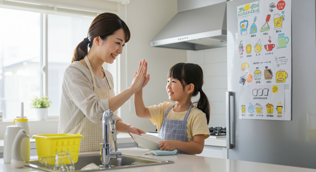 お手伝いをする際は、親が手本を見せることも効果的です。子どもは親の行動を見て学びます。親が家事を楽しそうにこなしている姿を見せることで、子どももお手伝いに対してポジティブなイメージを持ちやすくなります。また、親自身が感謝し合う姿を見せることで、感謝の文化が家庭に根付きます。